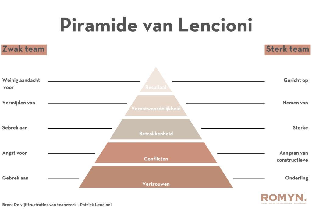 “De eerste stap is altijd het concreet beschrijven van de vraag van de opdrachtgever. We zorgen altijd voor maatwerk, dus het goed begrijpen van de behoefte is van groot belang. Op basis daarvan stel ik een passende aanpak samen. Ik geloof erin dat het begint bij de kwaliteiten en de sterke eigenschappen van mensen en teams. Dat is dan ook vaak een startpunt, zowel in vragen rondom teamontwikkeling als in leiderschapstrajecten. Een model dat ik veel gebruik om inzichtelijk te maken waar een team staat, is de Piramide van Lencioni. Dit model geeft heel duidelijk weer op welke aspecten van samenwerking het mis kan gaan. Wat ik dan vervolgens natuurlijk graag ombuig naar aspecten waar je aandacht aan mag besteden, om samenwerking juist een boost te geven.”