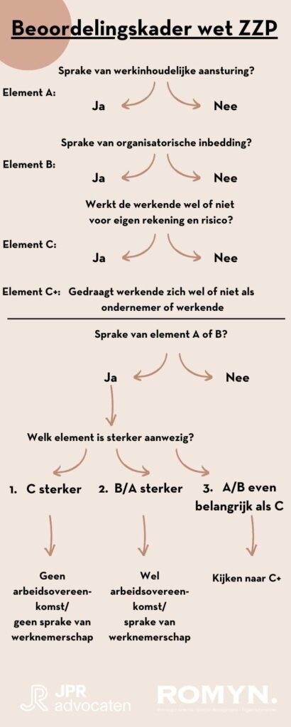 “Er wordt een rechtsvermoeden geïntroduceerd bij een salaris van minder dan €32,24 per uur. Dit houdt concreet het volgende in: wanneer een werkende aan kan tonen dat er sprake is van een uurtarief lager dan het bovenstaande bedrag, wordt vermoed dat er sprake is van een arbeidsovereenkomst. Het is dan aan de werkgever om aan te tonen dat er geen sprake is van een arbeidsovereenkomst. Als er twijfel bestaat over of de werkende een werknemer of zelfstandige is, wordt het onderstaande beoordelingskader aangehouden.”